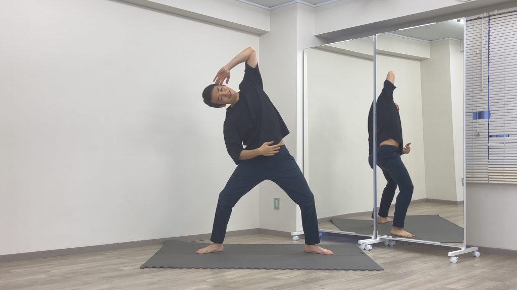 両足が地面についた状態で、上体を側屈していきましょう。ゆっくりと伸ばし、戻すを繰り返します。スピードは不要なので、勢いを使わずに行っていきましょう。
