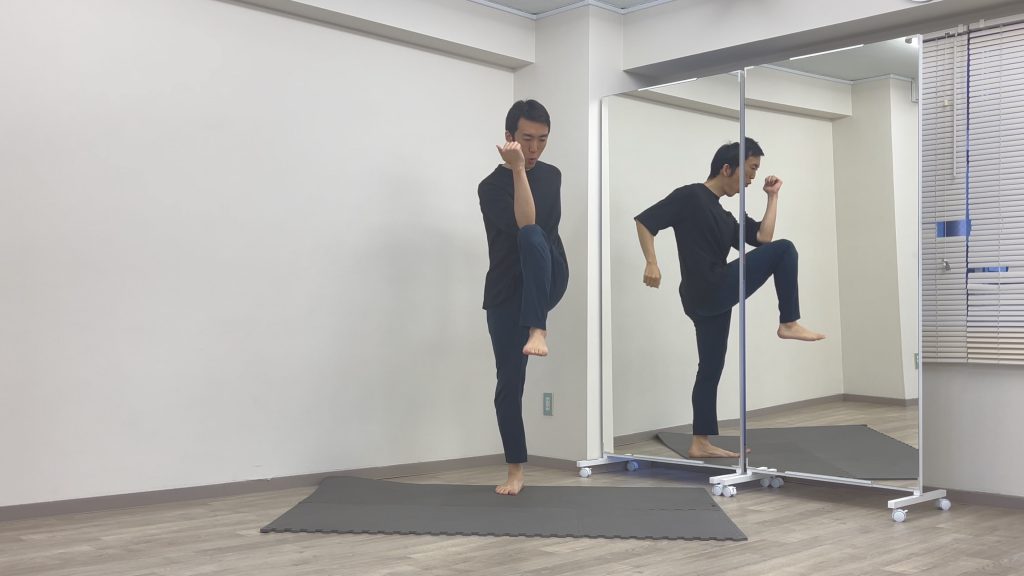 足踏みをしながら、3のリズムで腿を上げていきましょう。3のリズムで行うことで左右交互に腿を上げることになります。腿上げの際、お腹を凹ませる意識を持っておくと下腹にも効果的です。