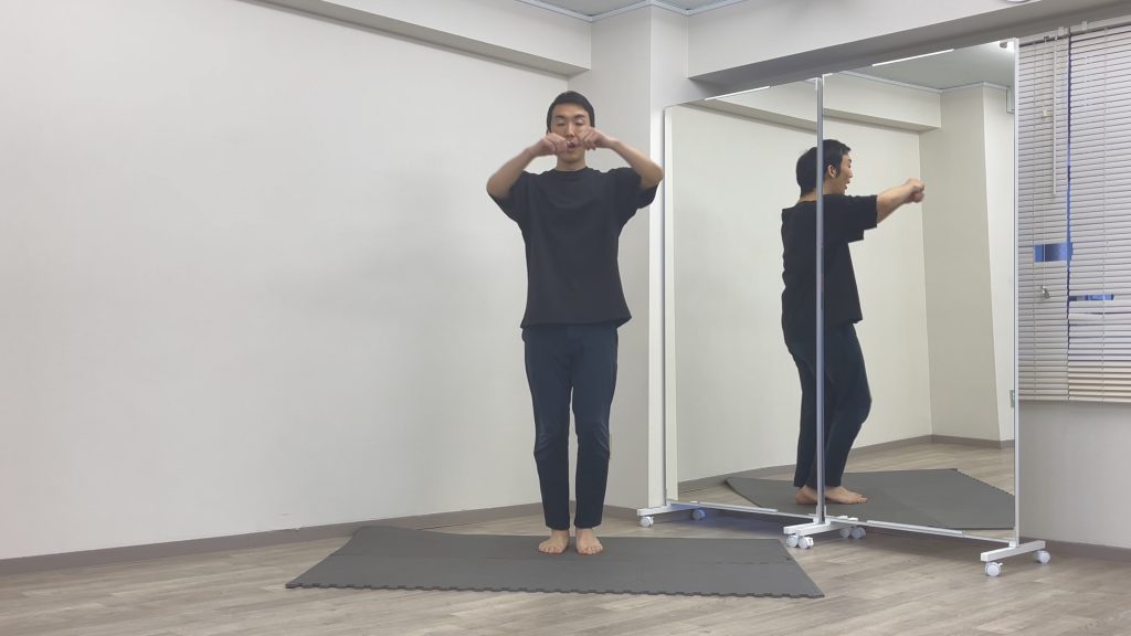 大きく前にパンチを左右交互に繰り返すエクササイズ。あくまでもフィットネスなので、フォームの綺麗さは全く気にしなくて良いですよ♪ とにかく楽しく大きく動いて、しっかりと脂肪燃焼していきましょう。