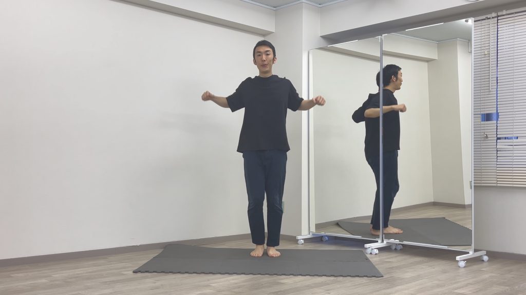 足踏みしながら腕を大きく前から後ろに回していきましょう。肩甲骨のほぐしにもなりますので、デスクワークなどで肩甲骨が凝り固まっている方にもおすすめです。